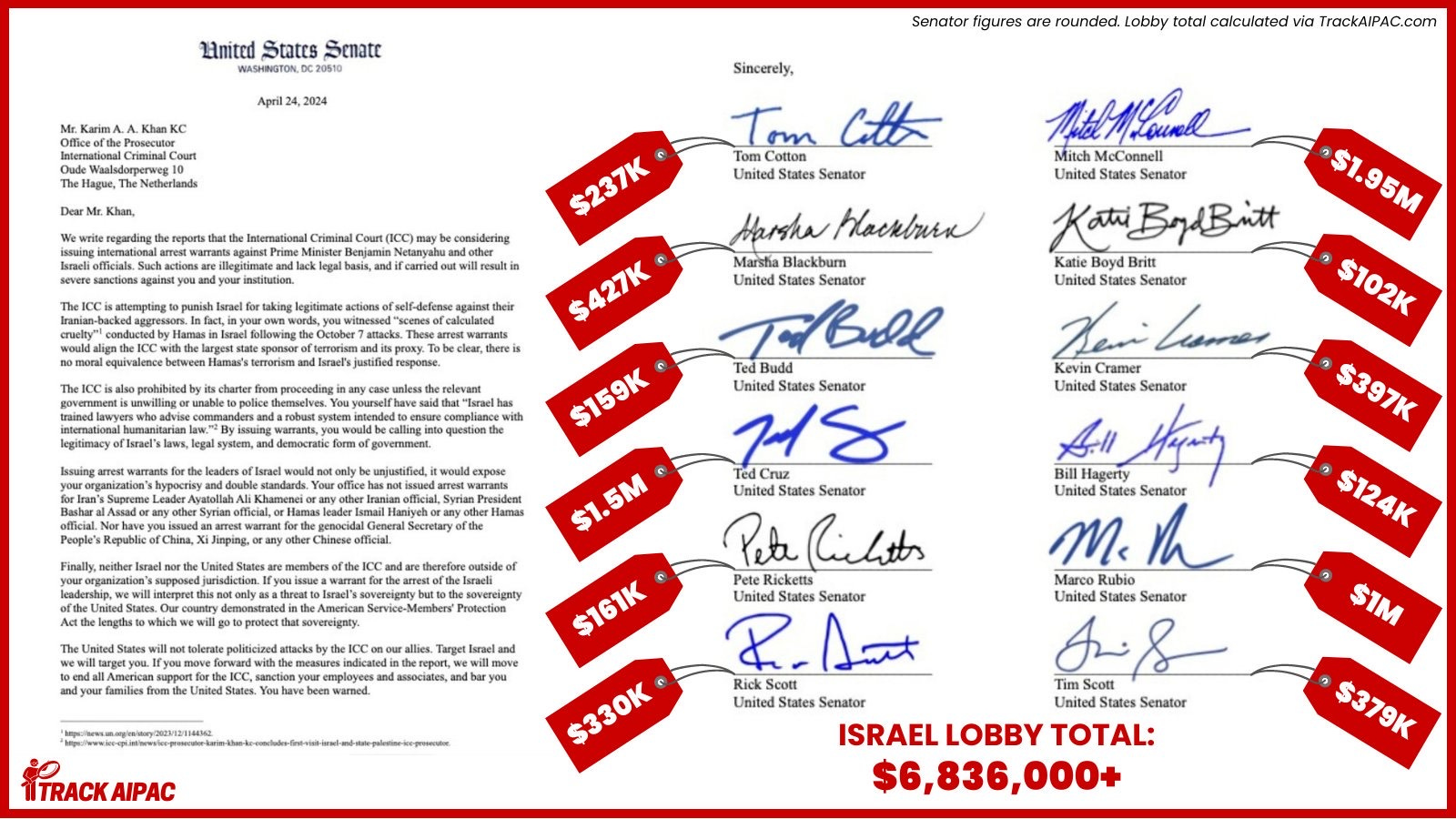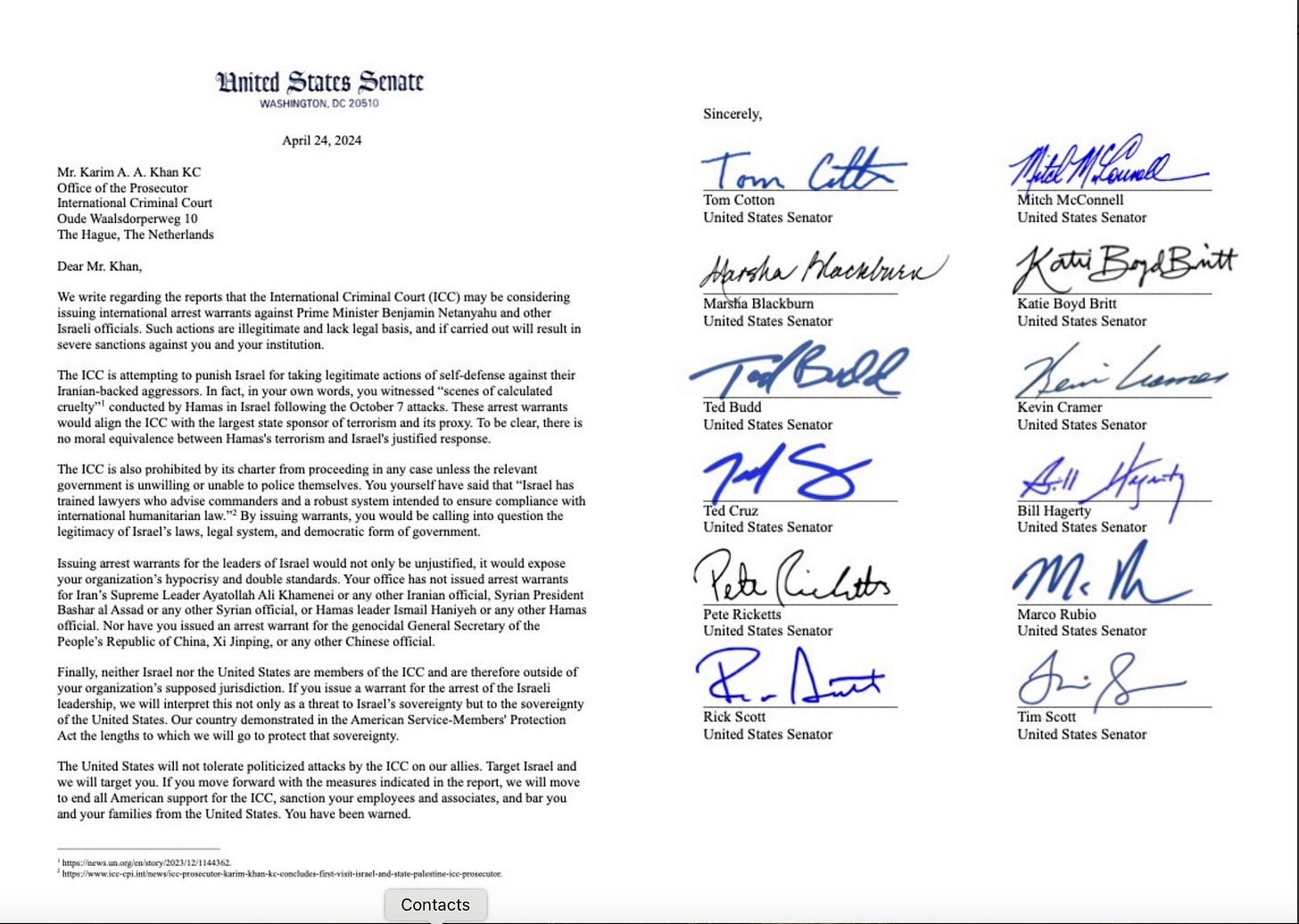 This is a letter sent by US senators to the International Criminal Court, threatening officials if they attempt to arrest members of the Israeli government